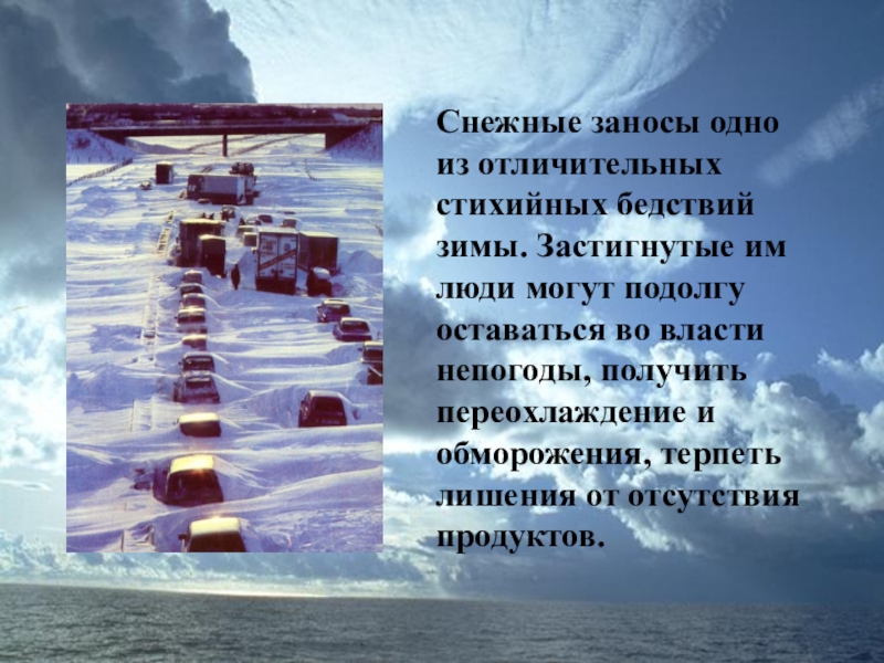 Слайд 6Снежные заносы одно из отличительных стихийных бедствий зимы. Застигнутые им люди