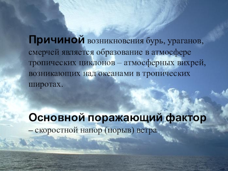 Слайд 5Причиной возникновения бурь, ураганов, смерчей является образование в атмосфере тропических циклонов