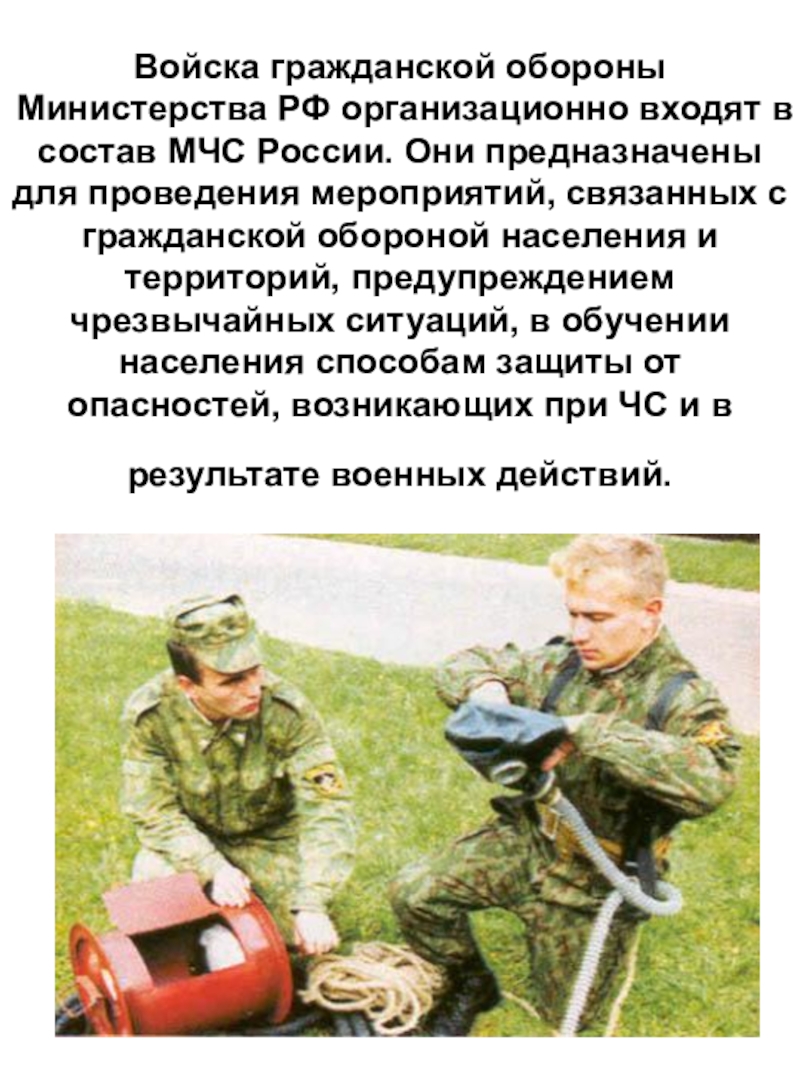 Слайд 6Войска гражданской обороны Министерства РФ организационно входят в состав МЧС России.