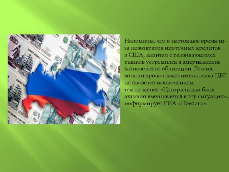 Слайд 4Напомним, что в настоящее время из-за невозвратов ипотечных кредитов в США, капитал с развивающихся рынков