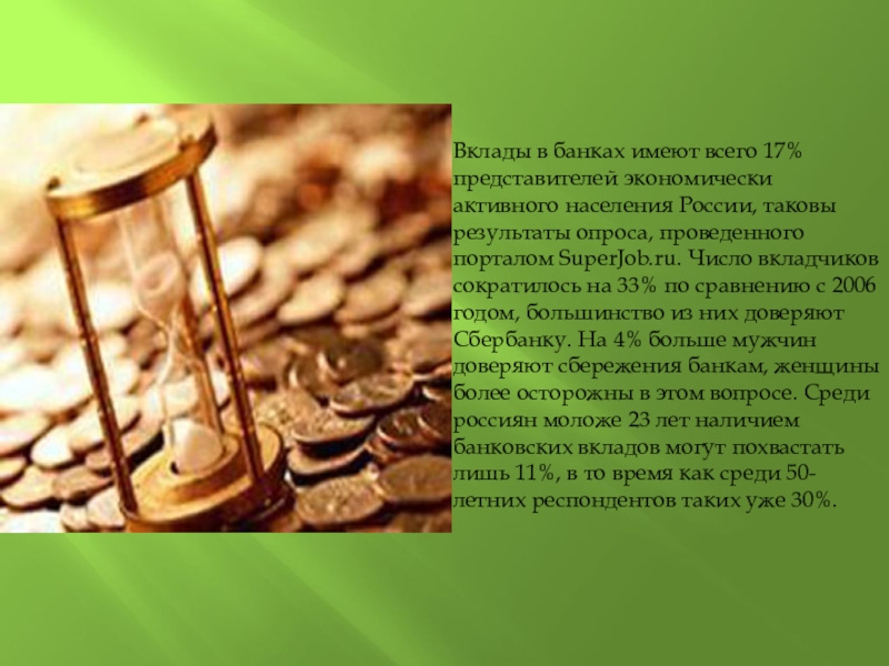 таковы результаты опроса, проведенного порталом SuperJob.ru. Число вкладчиков сократилось на 33% по сравнению с 2006 годом, большинство из них доверяют Сбербанку. На 4% больше мужчин доверяют сбережения банкам, женщины более осторожны в этом вопросе. Среди россиян моложе 23 лет наличием банковских вкладов могут похвастать лишь 11%, в то время как среди 50-летних респондентов таких уже 30%.