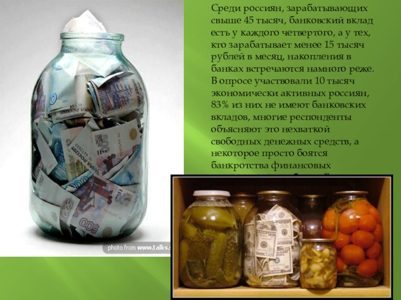Слайд 9Среди россиян, зарабатывающих свыше 45 тысяч, банковский вклад есть у каждого