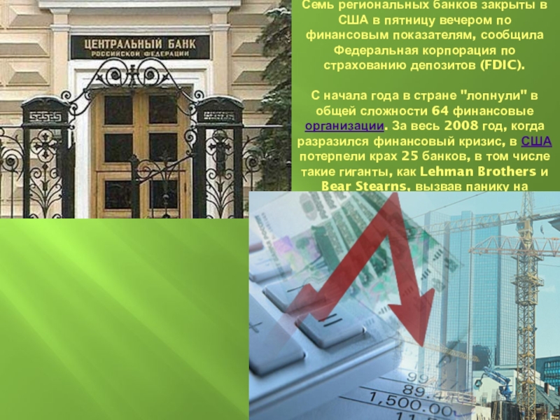 Слайд 10Семь региональных банков закрыты в США в пятницу вечером по финансовым