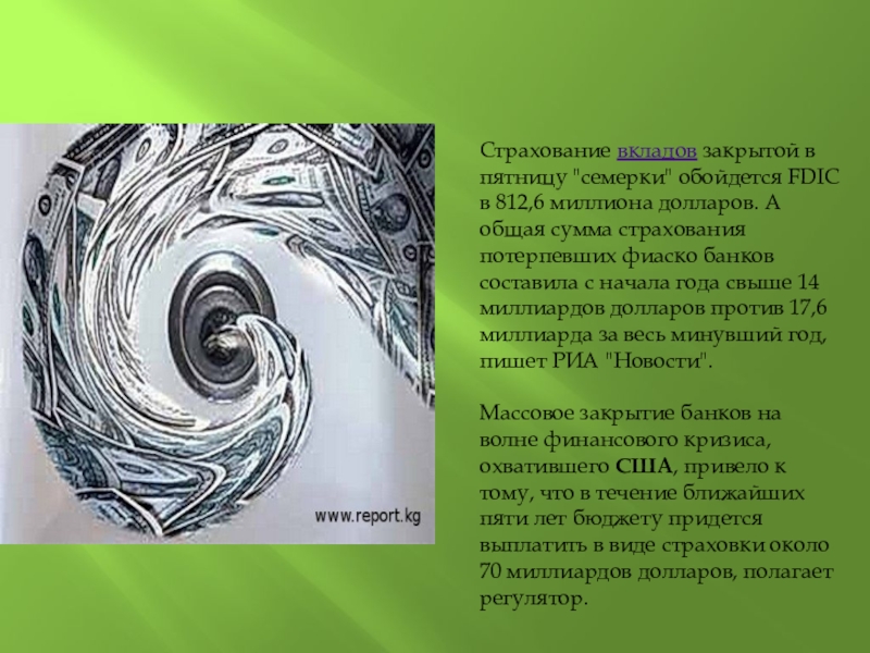 Массовое закрытие банков на волне финансового кризиса, охватившего США, привело к тому, что в течение ближайших пяти лет бюджету придется выплатить в виде страховки около 70 миллиардов долларов, полагает регулятор.