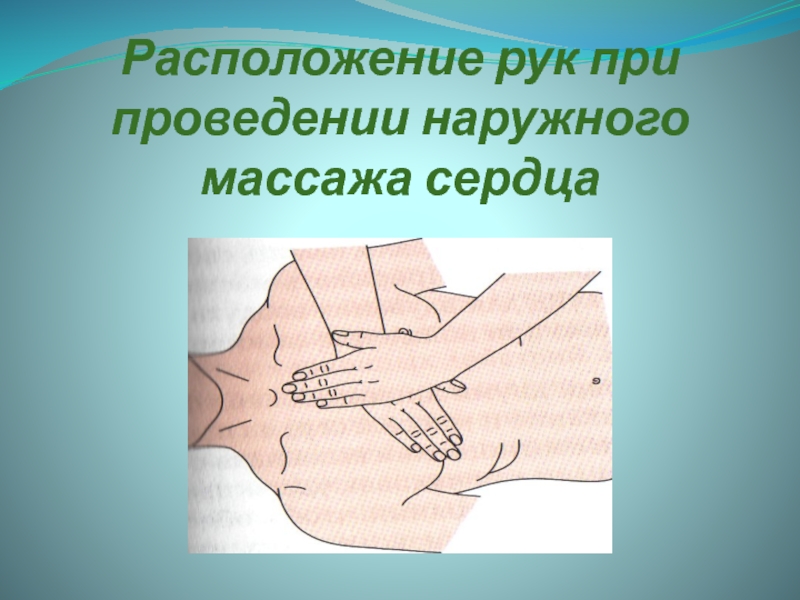 Слайд 9Расположение рук при проведении наружного массажа сердца
