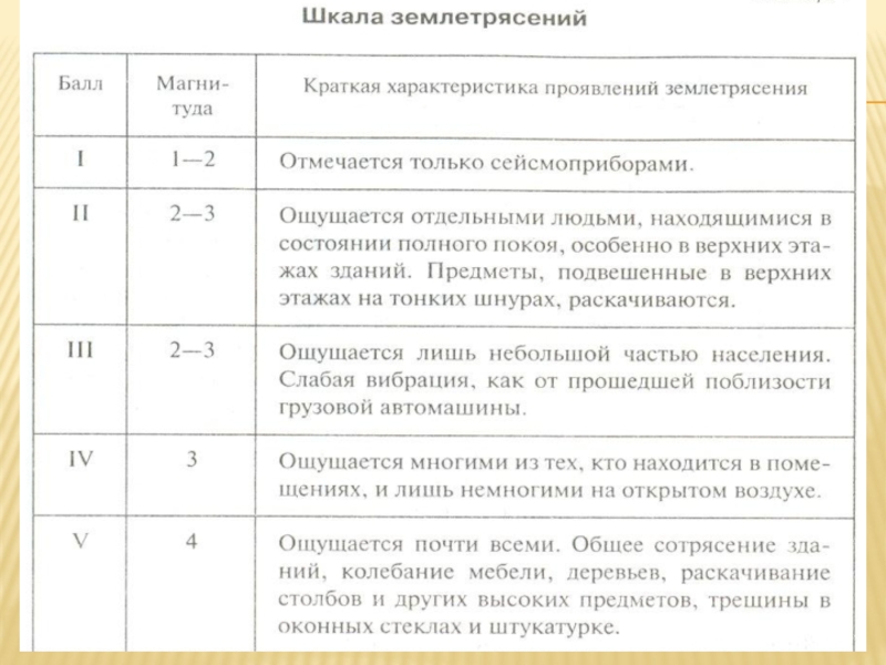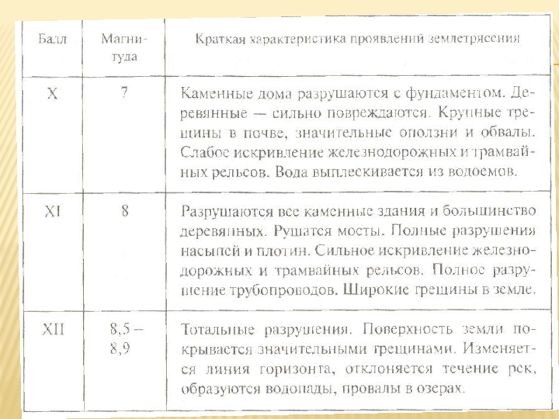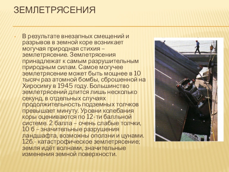 природная стихия – землетрясение. Землетрясения принадлежат к самым разрушительным природным силам. Самое могучее землетрясение может быть мощнее в 10 тысяч раз атомной бомбы, сброшенной на Хиросиму в 1945 году. Большинство землетрясений длится лишь несколько секунд, в отдельных случаях продолжительность подземных толчков превышает минуту. Уровни колебания коры оцениваются по 12-ти балльной системе. 2 балла – очень слабые толчки, 10 б – значительные разрушения ландшафта, возможны оползни и цунами. 12б.- катастрофическое землетрясение; земля идёт волнами, значительные изменения земной поверхности.