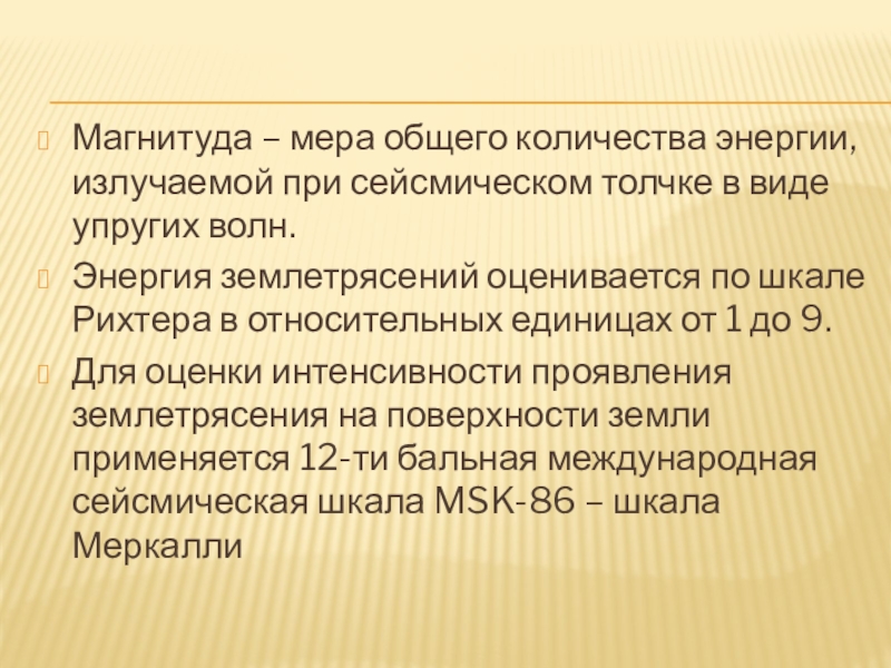 Слайд 8Магнитуда – мера общего количества энергии, излучаемой при сейсмическом толчке в