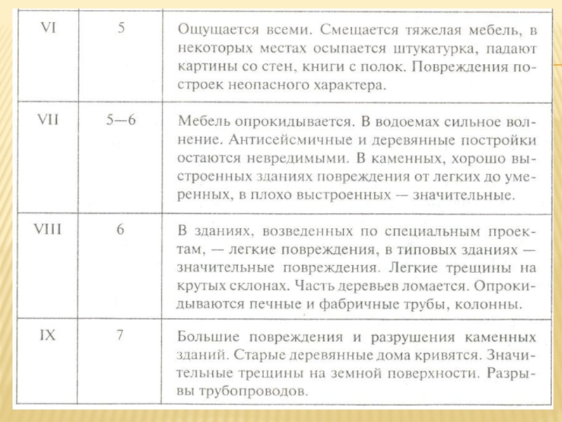 Для оценки интенсивности проявления землетрясения на поверхности земли применяется 12-ти бальная международная сейсмическая шкала MSK-86 – шкала Меркалли