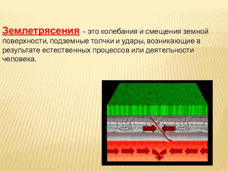 Слайд 6Землетрясения – это колебания и смещения земной поверхности, подземные толчки и