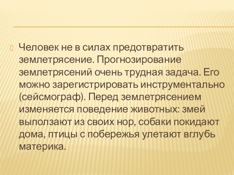 Слайд 18Человек не в силах предотвратить землетрясение. Прогнозирование землетрясений очень трудная задача.
