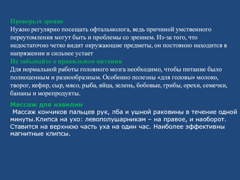 Массаж кончиков пальцев рук, лба и ушной раковины в течение одной минуты.Клипса на ухо: левополушарникам – на правое, и наоборот. Ставится на верхнюю часть уха на один час. Наиболее эффективны магнитные клипсы.
