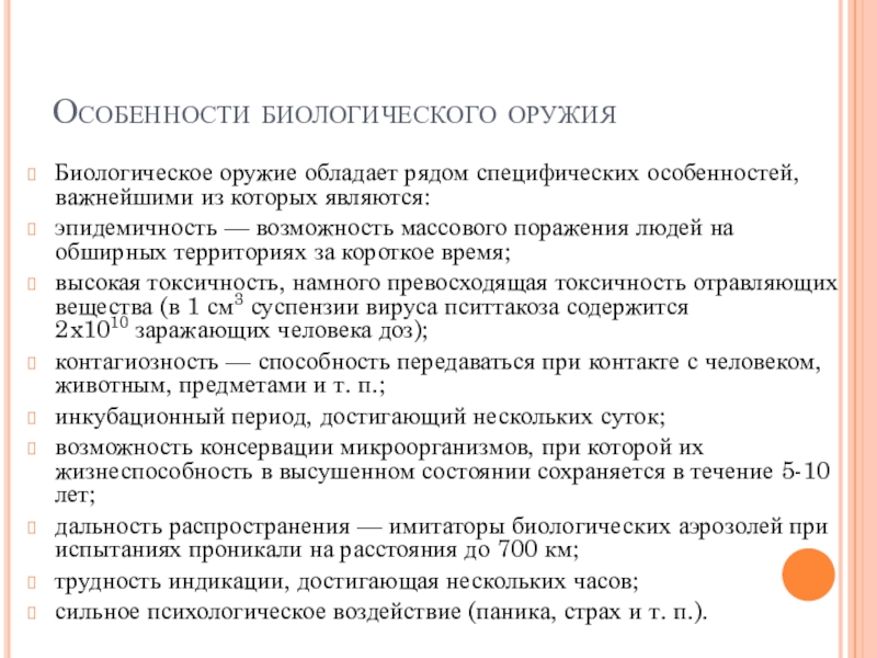Особенности биологического оружияБиологическое оружие обладает рядом специфических особенностей, важнейшими из которых являются:эпидемичность — возможность массового поражения людей