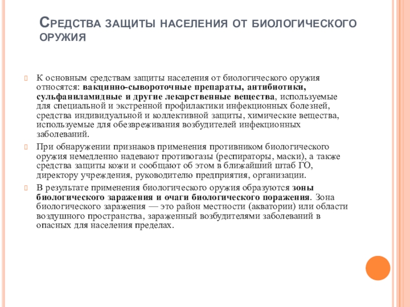Средства защиты населения от биологического оружия К основным средствам защиты населения от биологического оружия относятся: вакцинно-сывороточные препараты, антибиотики, сульфаниламидные