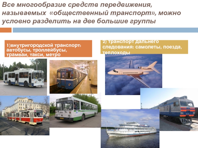 1)внутригородской транспорт: автобусы, троллейбусы, трамваи, такси, метро