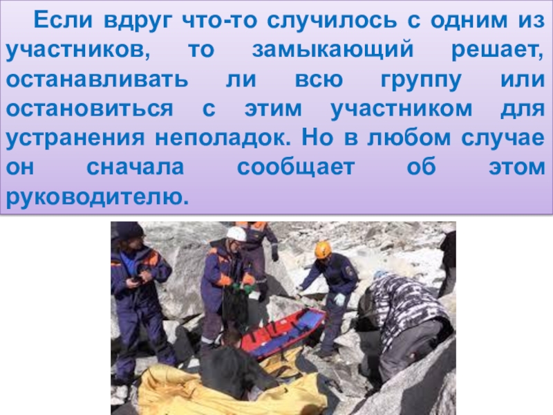 Слайд 9 Если вдруг что-то случилось с одним из участников, то замыкающий решает,