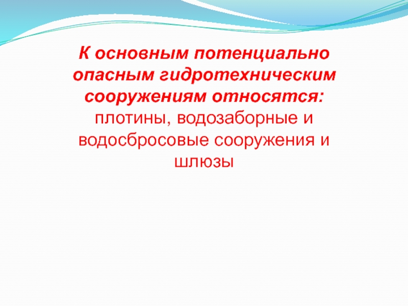Слайд 6К основным потенциально опасным гидротехническим сооружениям относятся: плотины, водозаборные и водосбросовые