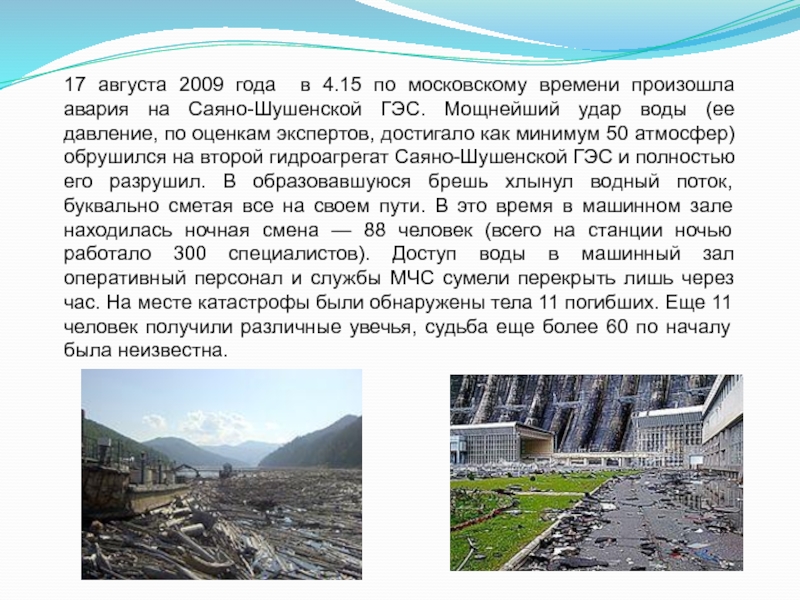 на Саяно-Шушенской ГЭС. Мощнейший удар воды (ее давление, по оценкам экспертов, достигало как минимум 50 атмосфер) обрушился на второй гидроагрегат Саяно-Шушенской ГЭС и полностью его разрушил. В образовавшуюся брешь хлынул водный поток, буквально сметая все на своем пути. В это время в машинном зале находилась ночная смена — 88 человек (всего на станции ночью работало 300 специалистов). Доступ воды в машинный зал оперативный персонал и службы МЧС сумели перекрыть лишь через час. На месте катастрофы были обнаружены тела 11 погибших. Еще 11 человек получили различные увечья, судьба еще более 60 по началу была неизвестна.