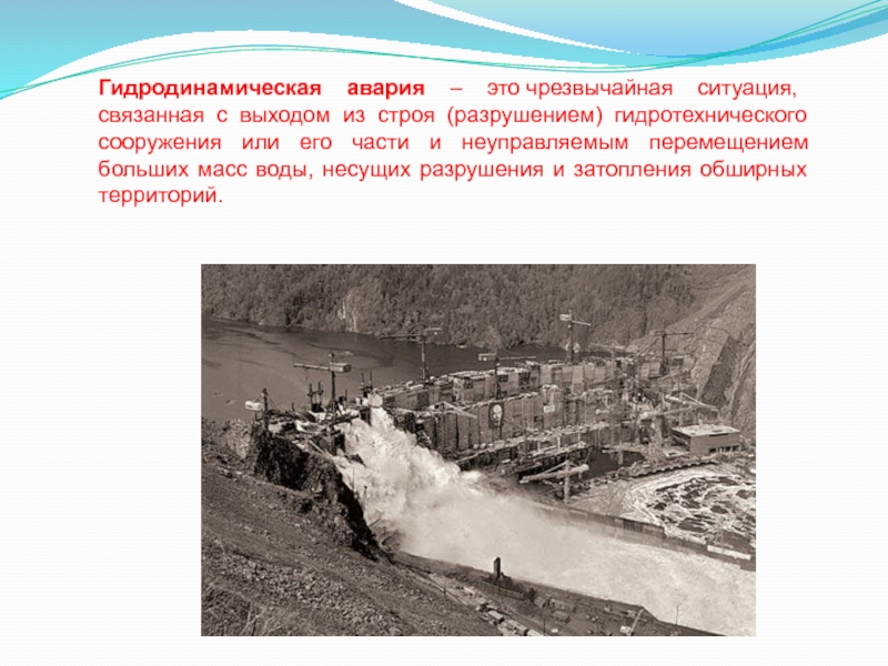 Слайд 10Гидродинамическая авария – это чрезвычайная ситуация, связанная с выходом из строя (разрушением)