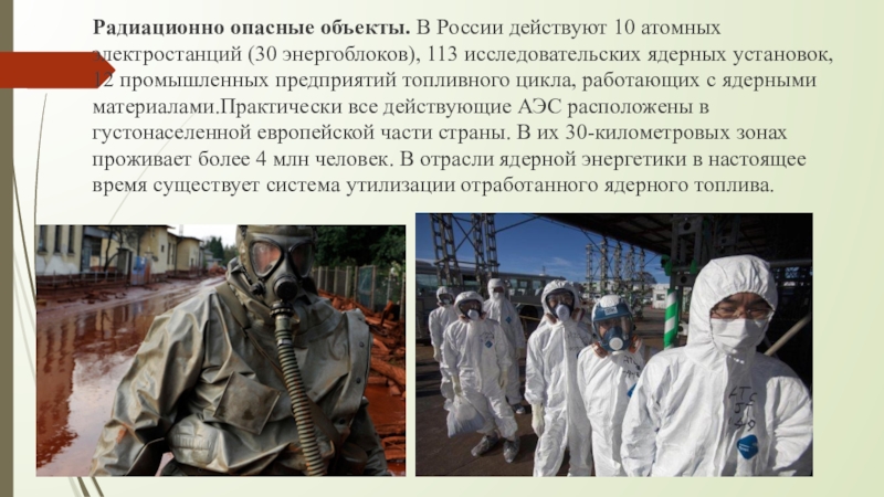 Слайд 5Радиационно опасные объекты. В России действуют 10 атомных электростанций (30 энергоблоков), 113