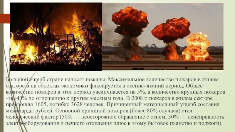 Слайд 4Большой ущерб стране наносят пожары. Максимальное количество пожаров в жилом секторе