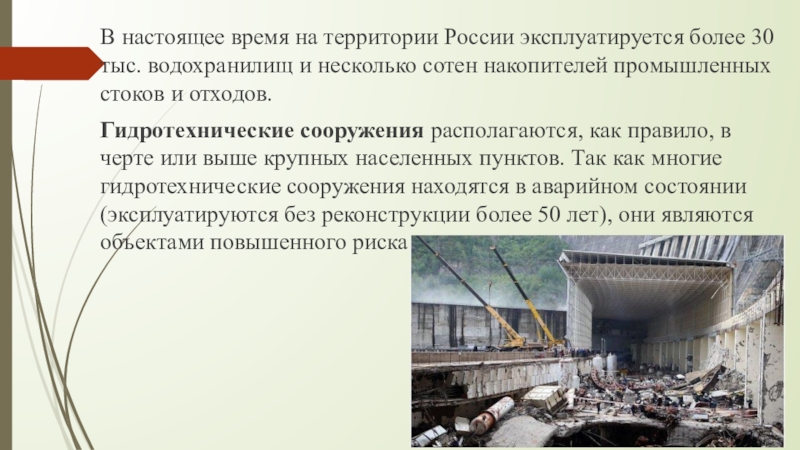 Гидротехнические сооружения располагаются, как правило, в черте или выше крупных населенных пунктов. Так как многие гидротехнические сооружения находятся в аварийном состоянии (эксплуатируются без реконструкции более 50 лет), они являются объектами повышенного риска.