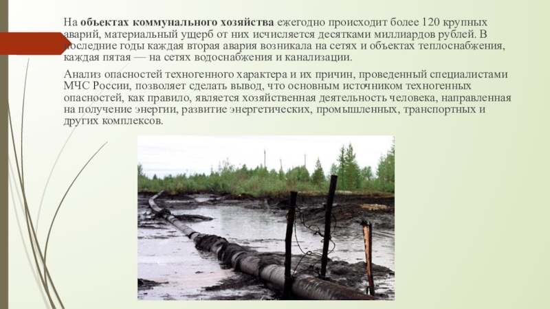 Слайд 10На объектах коммунального хозяйства ежегодно происходит более 120 крупных аварий, материальный ущерб от