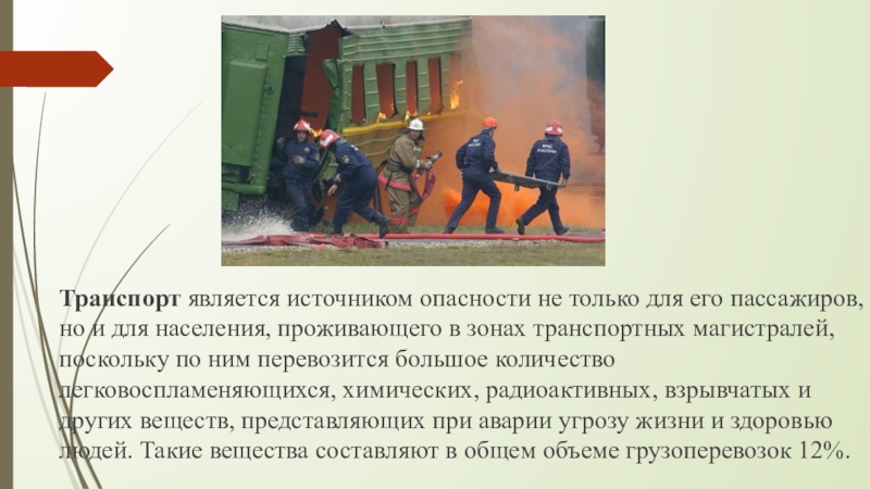 населения, проживающего в зонах транспортных магистралей, поскольку по ним перевозится большое количество легковоспламеняющихся, химических, радиоактивных, взрывчатых и других веществ, представляющих при аварии угрозу жизни и здоровью людей. Такие вещества составляют в общем объеме грузоперевозок 12%.