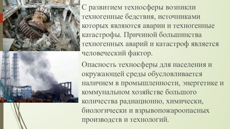 Слайд 2С развитием техносферы возникли техногенные бедствия, источниками которых являются аварии и