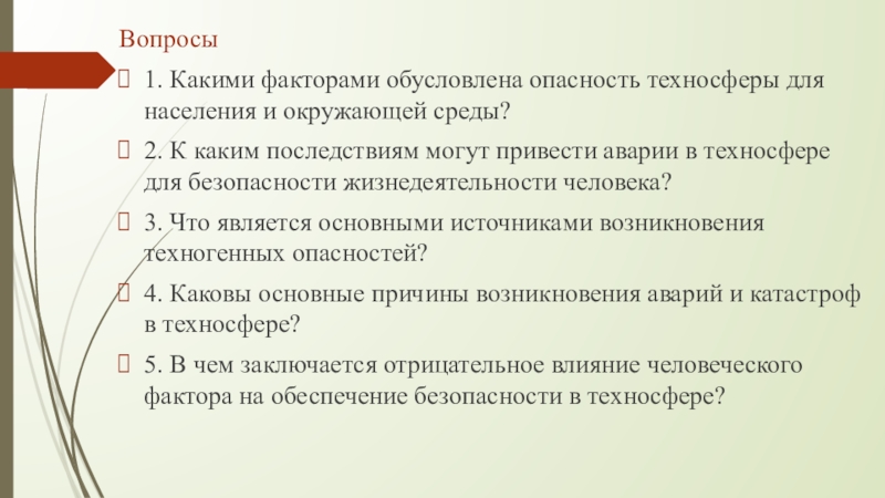 1. Какими факторами обусловлена опасность техносферы для населения и окружающей среды?