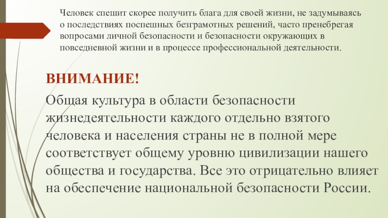 Общая культура в области безопасности жизнедеятельности каждого отдельно взятого человека и населения страны не в полной мере соответствует общему уровню цивилизации нашего общества и государства. Все это отрицательно влияет на обеспечение национальной безопасности России.