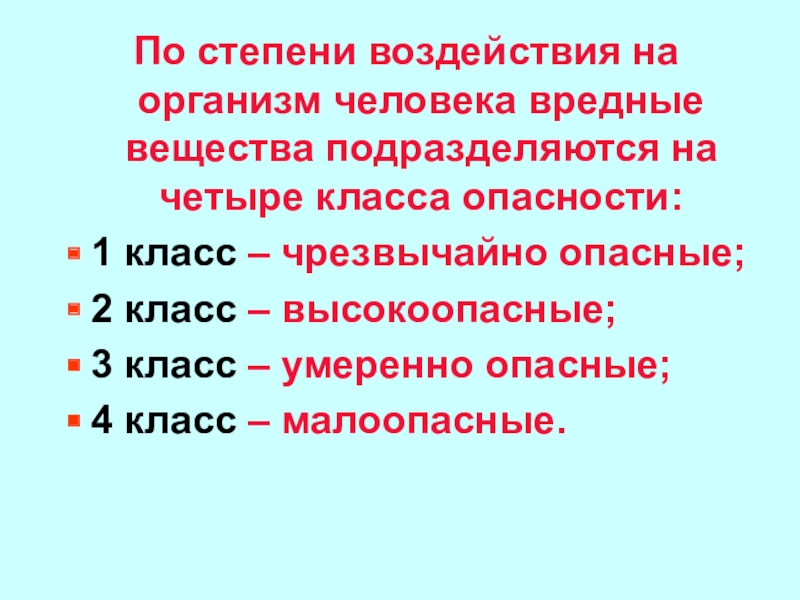3 класс – умеренно опасные: сероводород, соляная кислота, хлористый водород, сернистый водород и др.