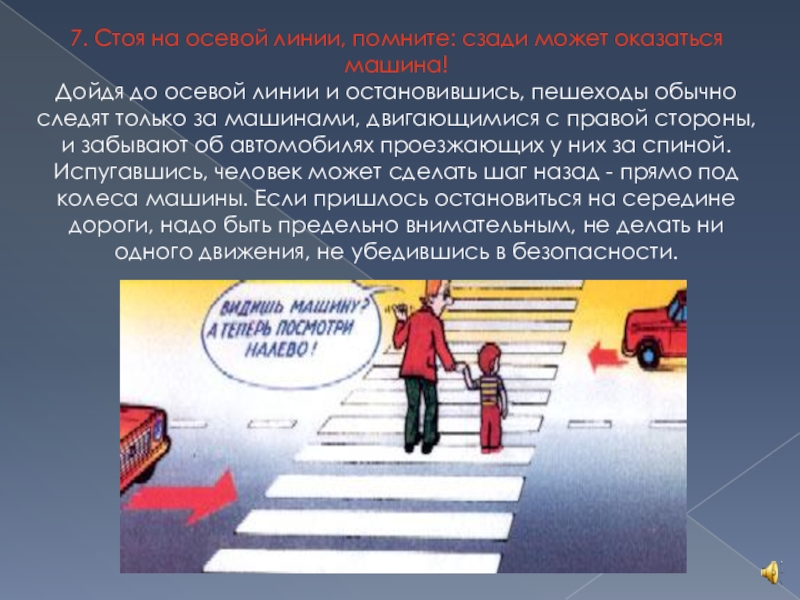 Слайд 707. Стоя на осевой линии, помните: сзади может оказаться машина!