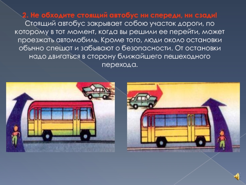 Слайд 652. Не обходите стоящий автобус ни спереди, ни сзади!