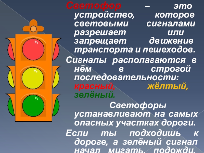 когда идти, а когда стоять и ждать. Красный свет для пешеходов - стой, желтый - жди, зеленый - иди. Никогда не переходи улицу на красный свет, даже если машин поблизости нет.