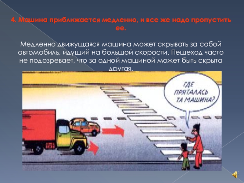 Слайд 674. Машина приближается медленно, и все же надо пропустить ее.