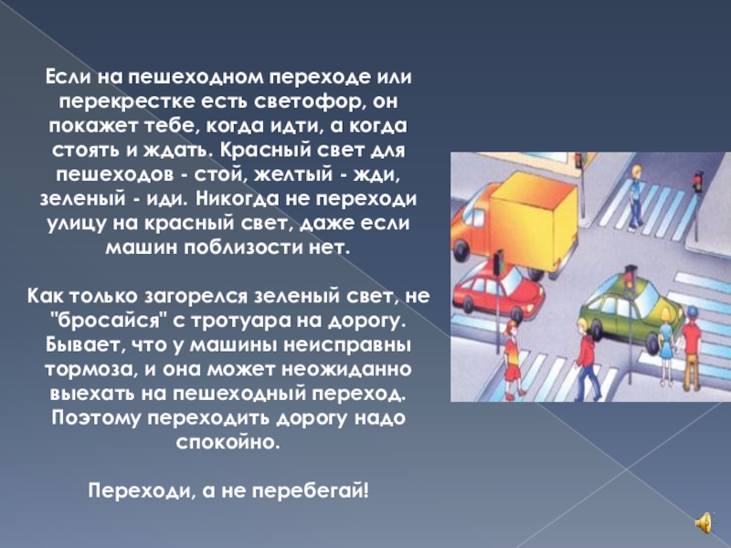 Как только загорелся зеленый свет, не "бросайся" с тротуара на дорогу. Бывает, что у машины неисправны тормоза, и она может неожиданно выехать на пешеходный переход. Поэтому переходить дорогу надо спокойно.