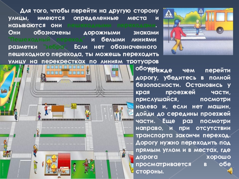 Прежде чем перейти дорогу, убедитесь в полной безопасности. Остановись у края проезжей части, прислушайся, посмотри налево и, если нет машин, дойди до середины проезжей части. Еще раз посмотри направо, и при отсутствии транспорта закончи переход. Дорогу нужно переходить под прямым углом и в местах, где дорога хорошо просматривается в обе стороны.