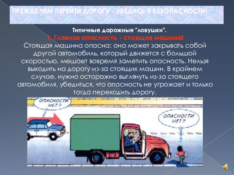 Стоящая машина опасна: она может закрывать собой другой автомобиль, который движется с большой скоростью, мешает вовремя заметить опасность. Нельзя выходить на дорогу из-за стоящих машин. В крайнем случае, нужно осторожно выглянуть из-за стоящего автомобиля, убедиться, что опасность не угрожает и только тогда переходить дорогу.