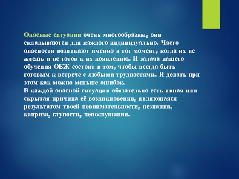 Слайд 3Опасные ситуации очень многообразны, они складываются для каждого индивидуально. Часто опасности