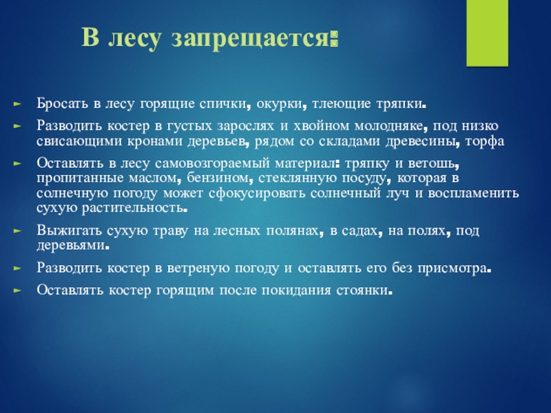 Оставлять в лесу самовозгораемый материал: тряпку и ветошь, пропитанные маслом, бензином, стеклянную посуду, которая в солнечную погоду может сфокусировать солнечный луч и воспламенить сухую растительность.