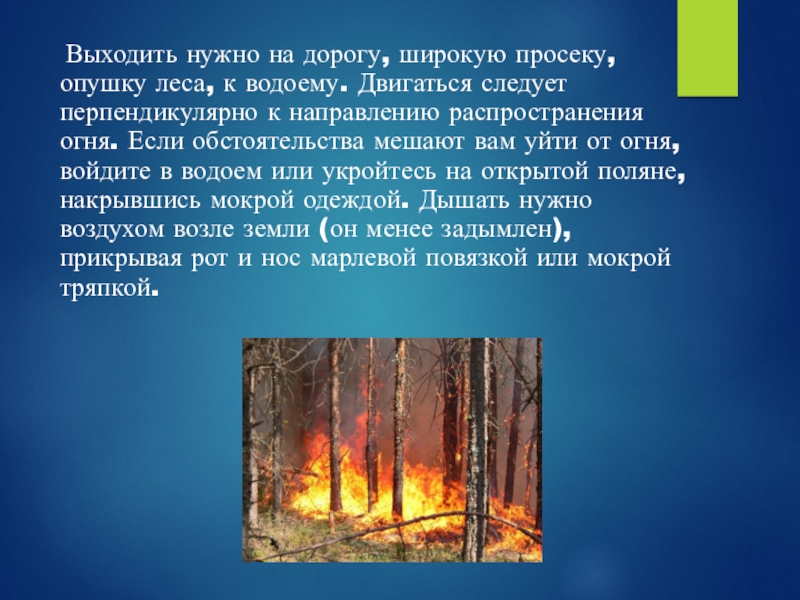 водоему. Двигаться следует перпендикулярно к направлению распространения огня. Если обстоятельства мешают вам уйти от огня, войдите в водоем или укройтесь на открытой поляне, накрывшись мокрой одеждой. Дышать нужно воздухом возле земли (он менее задымлен), прикрывая рот и нос марлевой повязкой или мокрой тряпкой.