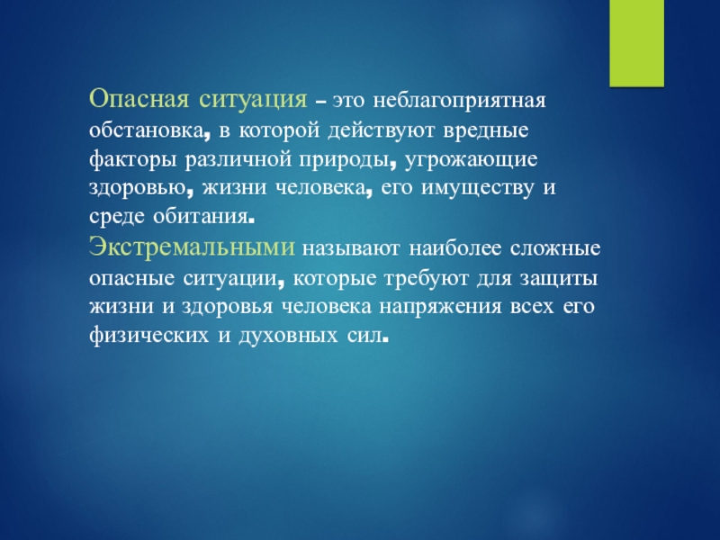 Слайд 2Опасная ситуация – это неблагоприятная обстановка, в которой действуют вредные факторы