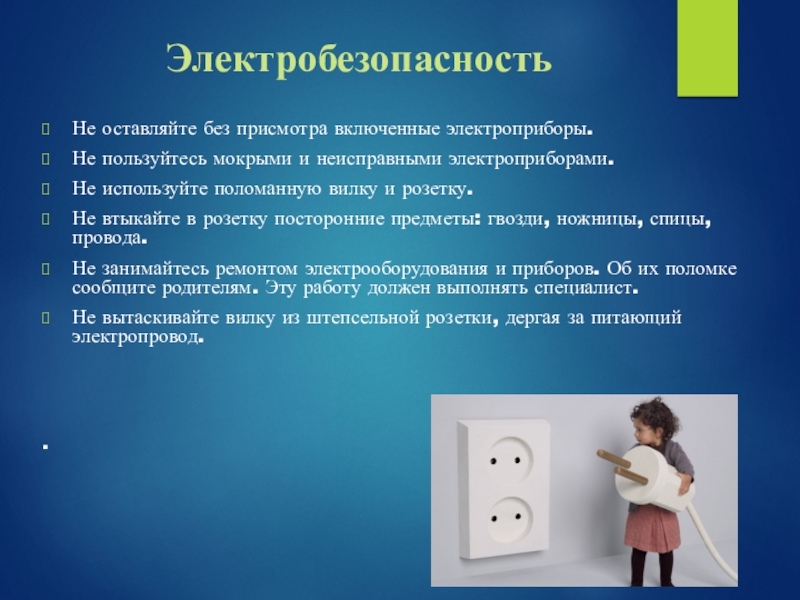 Не занимайтесь ремонтом электрооборудования и приборов. Об их поломке сообщите родителям. Эту работу должен выполнять специалист.