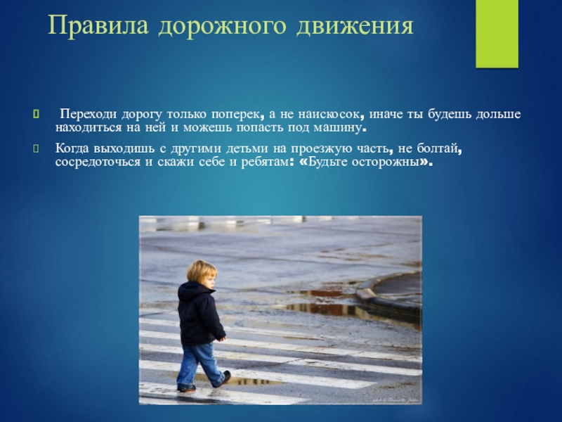 Когда выходишь с другими детьми на проезжую часть, не болтай, сосредоточься и скажи себе и ребятам: «Будьте осторожны».