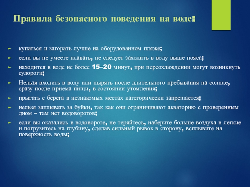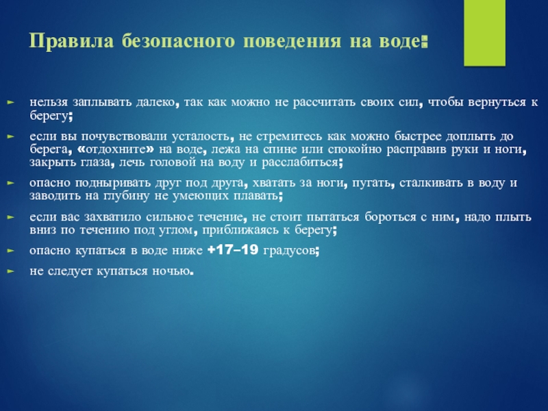 Нельзя входить в воду или нырять после длительного пребывания на солнце, сразу после приема пищи, в состоянии утомления;