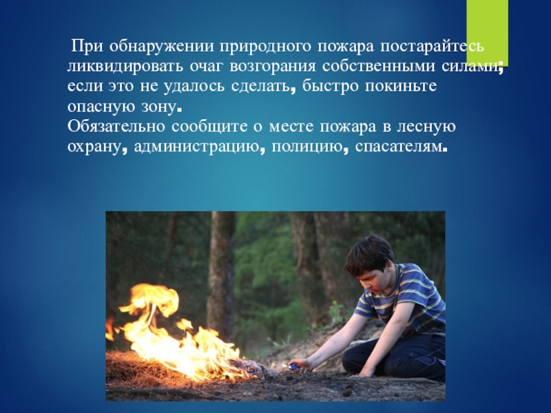 Слайд 11 При обнаружении природного пожара постарайтесь ликвидировать очаг возгорания собственными