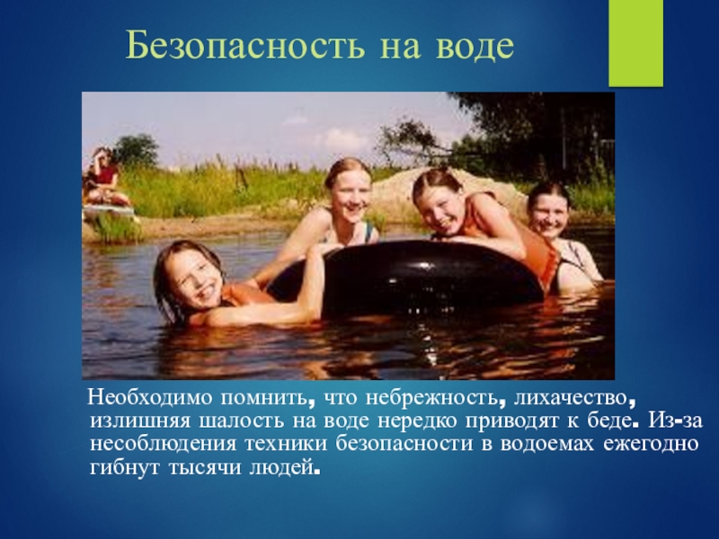 шалость на воде нередко приводят к беде. Из-за несоблюдения техники безопасности в водоемах ежегодно гибнут тысячи людей.