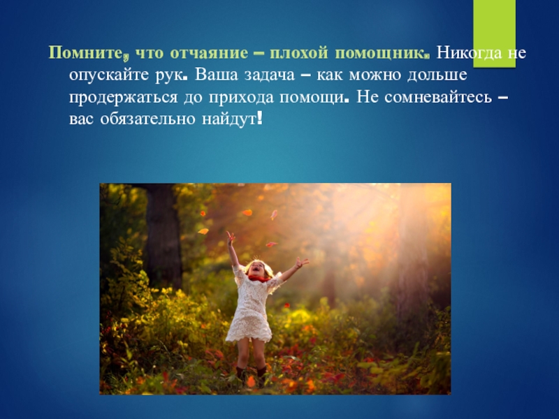 Слайд 8Помните, что отчаяние – плохой помощник. Никогда не опускайте рук. Ваша