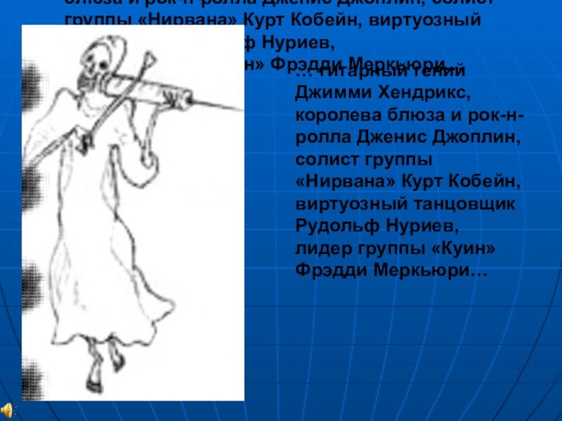… гитарный гений Джимми Хендрикс, королева блюза и рок-н-ролла Дженис Джоплин, солист группы «Нирвана» Курт Кобейн, виртуозный танцовщик Рудольф Нуриев,