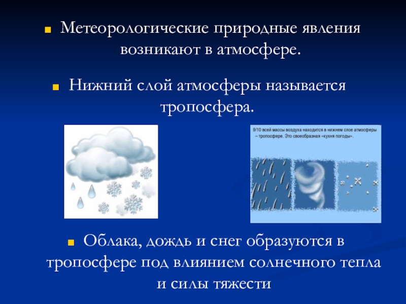 Облака, дождь и снег образуются в тропосфере под влиянием солнечного тепла и силы тяжести